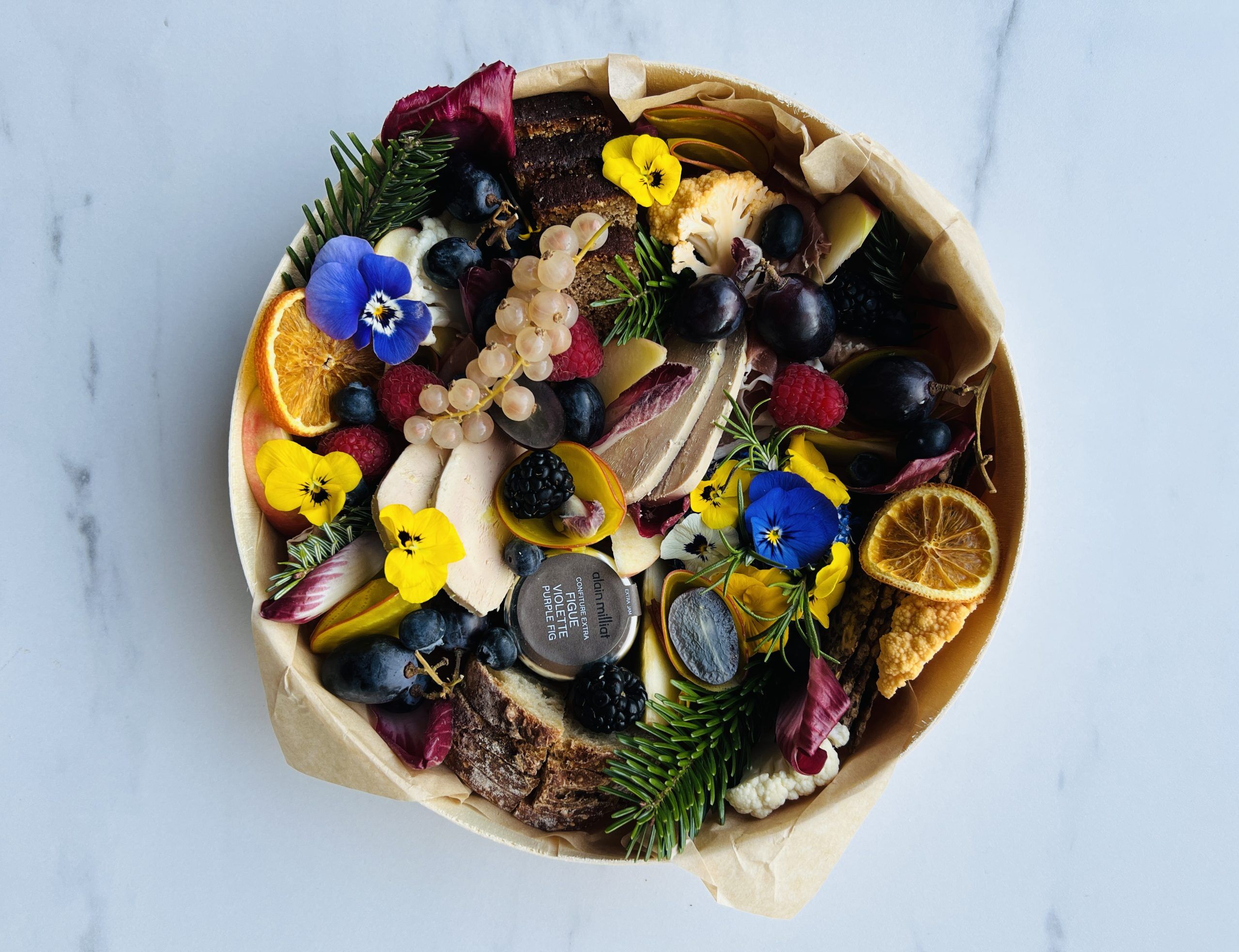 Ses couleurs à la fois sombres et pâles, qui m’ont inspirées pour cette gourmande et festive composition. La pièce maîtresse de cette planche est un foie gras de canard mi-cuit, accompagné d’une délicieuse et acidulée gelée d’épines d’Epicéa…