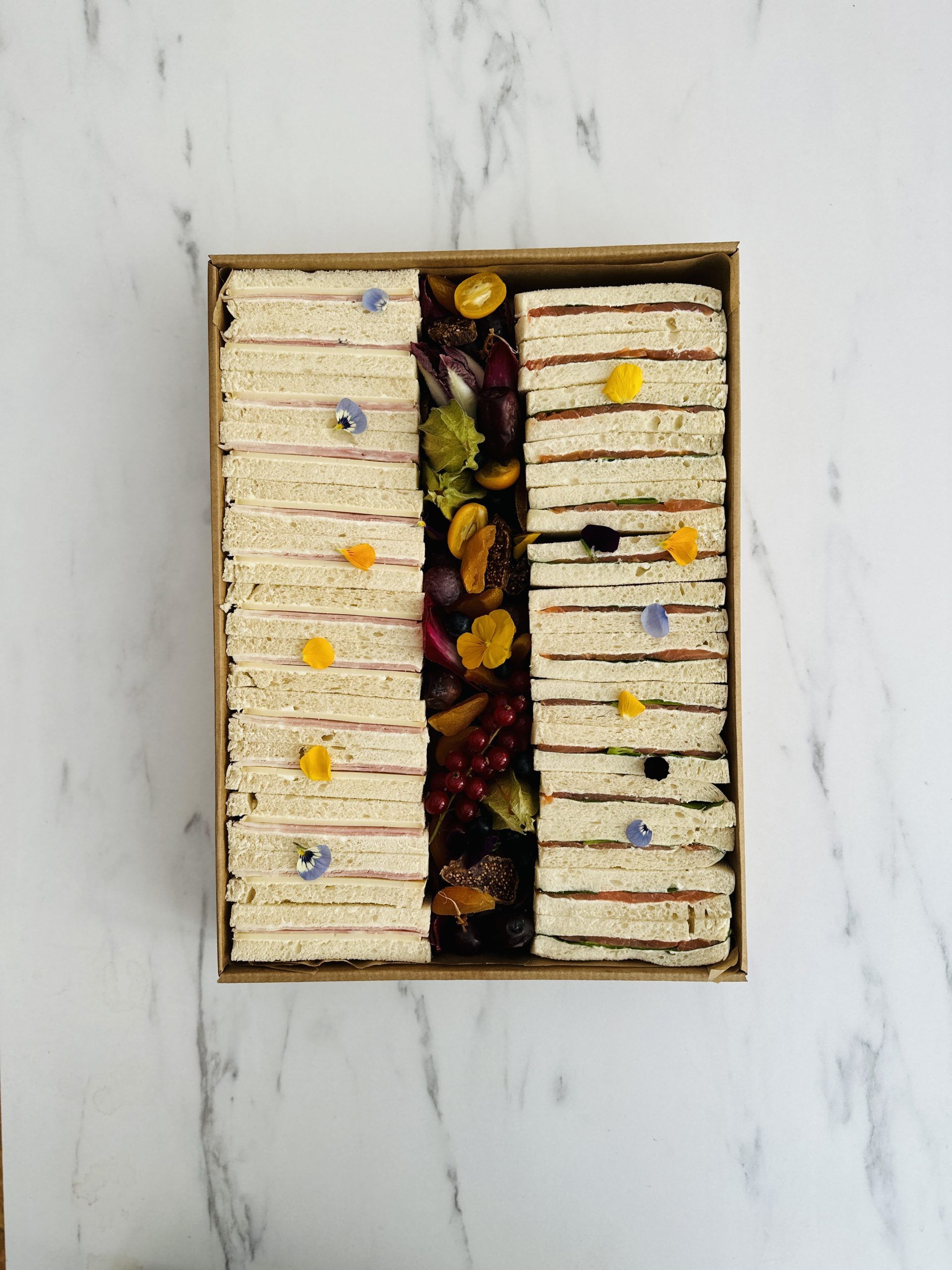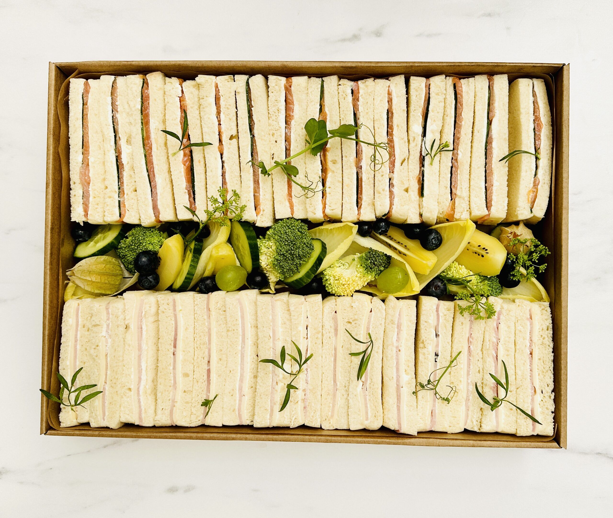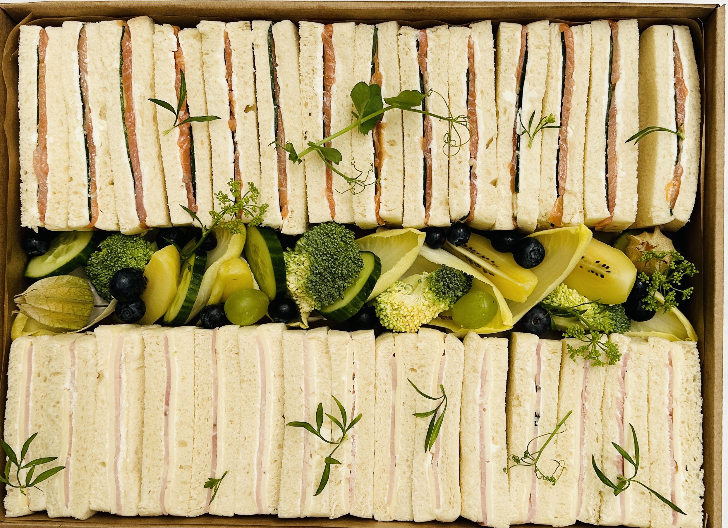 Coin Bleu : Fingers sandwichs* truite fumée des Pyrénées & concombre sur cream cheese*.